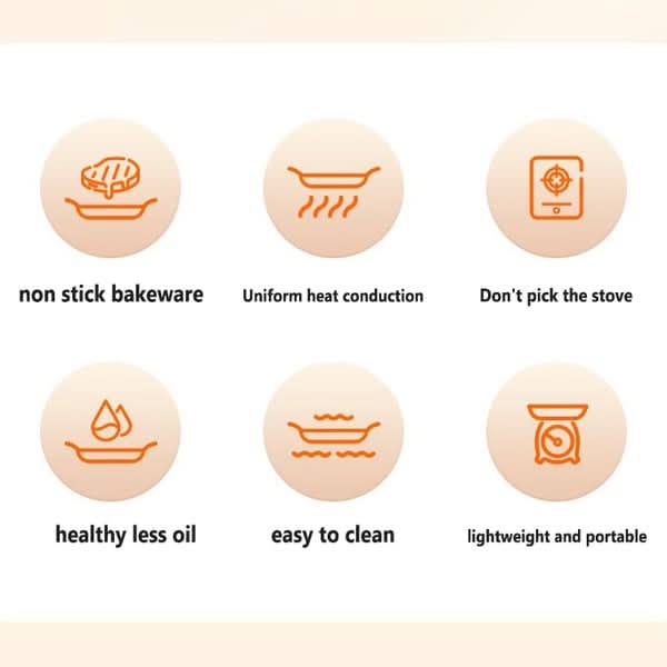 Snelle opwarming, gelijkmatige warmtegeleiding, geschikt voor gebruik op meerdere fornuizen. Geen oliespatten, geen olieverspilling, geschikt voor koken en grillen.